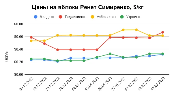 В сегменте яблок в основном пересматривались цены на сорт «Ренет Симиренко», который по итогам отчетного периода подорожал в Молдове и Таджикистане ввиду некоторого снижения его предложения на этих рынках. Под конец текущей недели средняя цена на яблоко «Ренет Симиренко» в Молдове поднялась до $0,32/кг, а в Таджикистане достигла $0,67/кг.