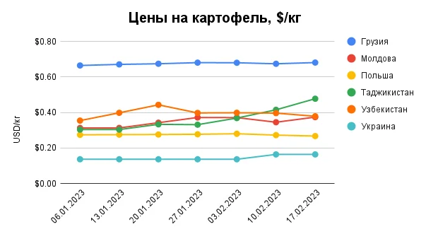 Так, картофель на текущей неделе продолжал дорожать в Таджикистане, где участники рынка сообщали о довольно серьезном дефиците этой продукции. Отметим, что текущая средняя цена на картофель на таджикском рынке ($0,48/кг) была уже на 80% выше прошлогодней! Также цены на картофель были немного откорректированы в сторону повышения в Молдове, поднявшись в среднем до $0,37/кг.
